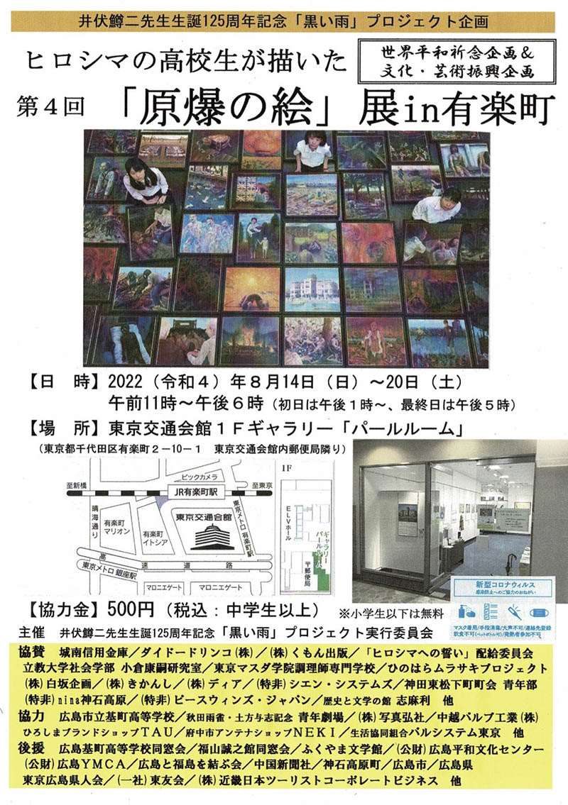 昨年は新春の1月22日に「核兵器禁止条約」が発効され、 夏には平和の祭典=東京オリンピック・パラリンピックが 開催される等、コロナ禍の中、人類が1つになって世界的 感染症に立ち向かい、いよいよ今年は「核兵器も終わりの 始まり」(サーロー節子さん談)に向けた年に舵を切って ほしいと切に願っていた矢先、2月にロシアがウクライナ へ攻め込み、核兵器使用をちらつかせる事態になろうとは 思いもしませんでした…。 瞬く間に第3次世界大戦開戦の危機に陥るほど、世界平和 とは脆いものなのか…近づいたと思った「核亡き世界」が これほど遠ざかったように感じられたこともありません。 しかしながら、こうした時だからこそ諦めてはならない・ 後退してはいけないとの想いを強くした私ども【井伏鱒二 先生生誕125周年記念「黒い雨」プロジェクト実行委員会】 では、「核兵器禁止条約」発効の流れを断ち切ることなく、 また過去3回の本催事に来場された被爆者の方々との約束 =「継続は力なり」を果たすべく、3密に十分に配慮して 開催する決断を致しました。 1日も早いコロナ禍の収束、そしてウクライナをはじめと する戦時下にある国や地域の平和・復興が待ち望まれる中、 以下のように昨夏以上に様々な想い・願いを、そして祈り を込めて行う 【第4回ヒロシマの高校生が描いた「原爆の絵」展in有楽町】 です。 今夏も、ネットでは感じ得ないライブ空間のギャラリーで、 高校生の真心と熱意が込められた優れた作品の数々に触れ、 何かしらの学び・気づきを、たくさんの元気・勇気、希望 を得ていただければ幸いです。 <催事名称> 第4回ヒロシマの高校生が描いた「原爆の絵」展in有楽町 <催事日時> 2022(令和4)年8月14日(日)〜20日(土) 11:00〜18:00(初日は13:00〜、最終日は17:00) <催事場所> 東京交通会館1Fギャラリー「パールルーム」 (東京都千代田区有楽町2−10−1 1F郵便局隣り) https://www.kotsukaikan.co.jp/business/gallery/ <展示点数> 約30点(但し、原画ではなく基町高校製作「特製パネル」) <協力金(入場料)> 500円(税込:中学生以上、小学生以下は無料) 今回も開催場所は東京有楽町ゆえ、井伏鱒二先生生誕125 周年記念「黒い雨」プロジェクト実行委員会の本部(広島 県神石高原町)ではなく、過去3回と同じく、東京事務局 (担当:大越)が中心となって取り組む方針です。 つきましては、貴同窓会(本部)のHPに加え、東京支部 のHPでもご案内いただきますよう、何卒よろしくお願い 申し上げます。 最後になりましたが、コロナ禍:第7波が再拡大中であり、 今夏も猛暑(異常気象)ゆえ、くれぐれもご自愛ください。 取り急ぎ催事の貴同窓会(本部&東京支部)HP掲載のお願いまで 大越 貴之 (井伏鱒二先生生誕125周年記念「黒い雨」プロジェクト実行委員会 事務局長) ※来年2023(令和5)年は井伏鱒二の生誕125周年&没後30周年となります |