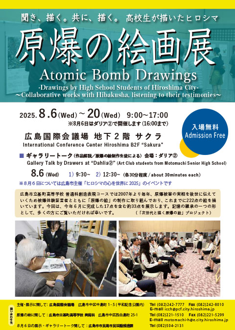 広島市立基町高等学校創造表現コースでは 2007年より毎年、広島平和文化センター主催事業 「次世代と描く原爆の絵」に制作ボランティアと して参加し、現在までに222点の原爆の絵が完成して います。高校生が描いた原爆の絵を、毎年8月と12月 に、広島国際会議場においてその作品の一部を一般 公開しています。