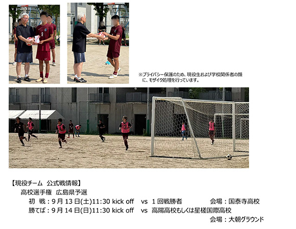 OB会総会の冒頭では、OB会会長から、活動支援金 10万円およびボールを現役生に贈呈。現役生の キャプテンは、それに応え、「基町高校で引き 継がれてきた伝統をベースに、自分たちの オリジナリティを付加し、良いチームを作り 上げて、高校選手権予選に臨んでいきたい」と 高校選手権予選に向けた抱負を力強く語りました。