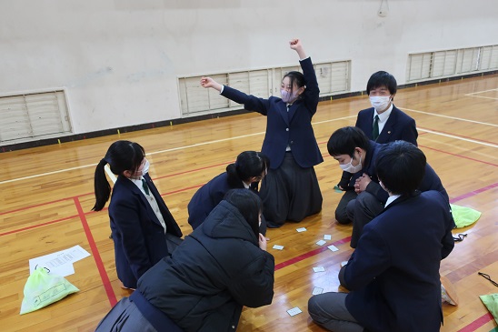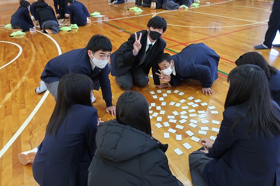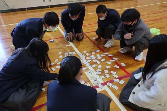 教師1人10枚、計10人が読み札を読みあげ、生徒たちが取り札の獲得枚数を競い、個人賞とクラス賞を目指してチャレンジしました。